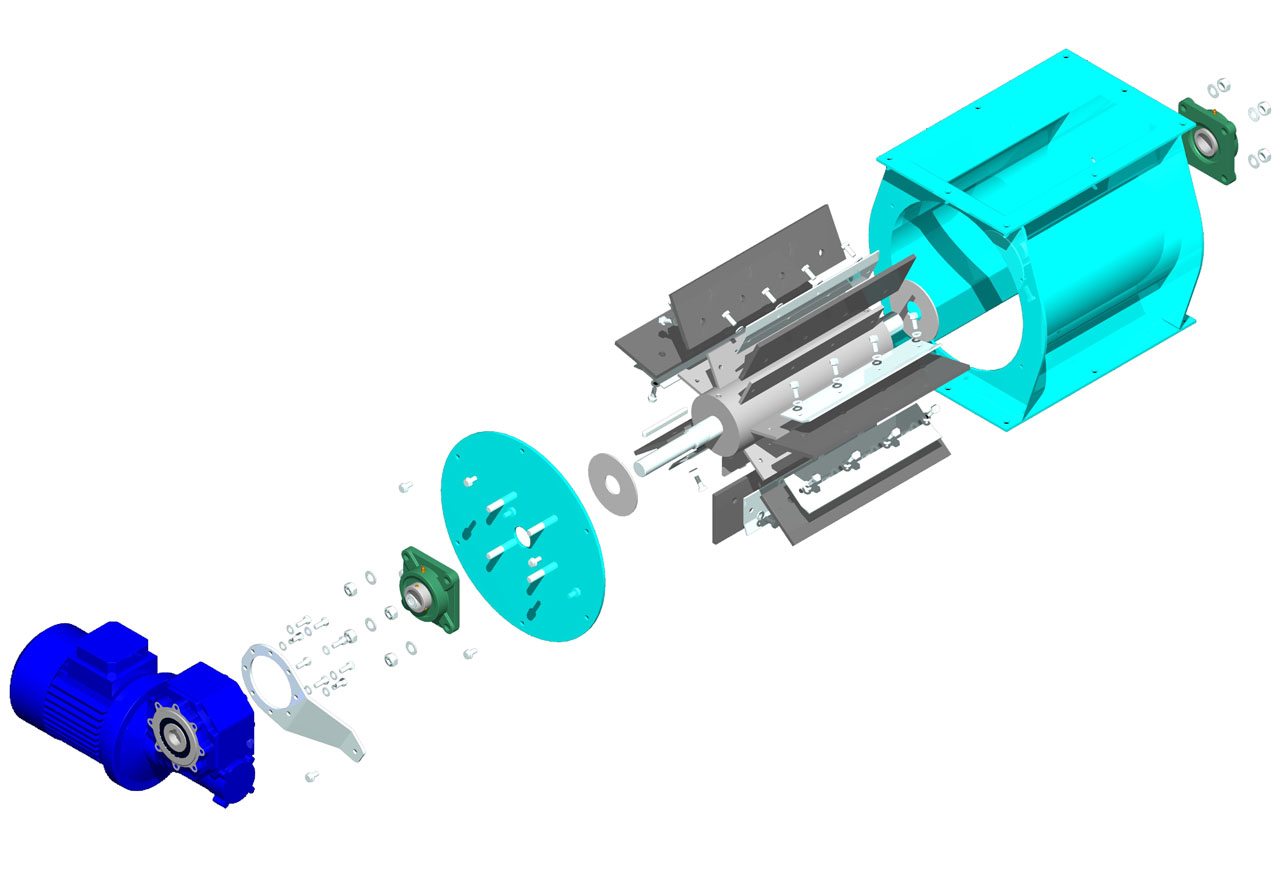 La valvola rotativa a caduta "EV" è stata progettata per il dosaggio e scarico di svariati tipi di polveri, trucioli, cippati, scarti industriali e rifiuti riciclati anche di grossa pezzatura.